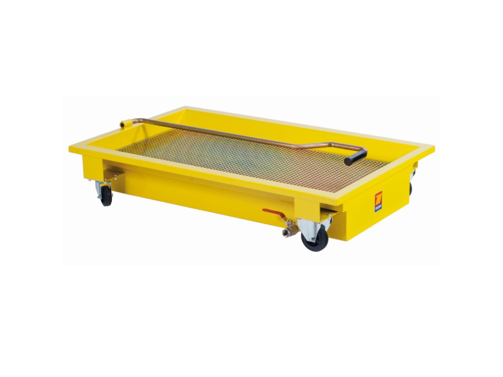 Mobiler Wagen für die Sammlung von Altöl. Der Wagen ist mit einem Gitter ausgestattet, das für Tropfkörper usw. geeignet ist.Der Wagen ist mit einem Ablassventil zum Entleeren ausgestattet.