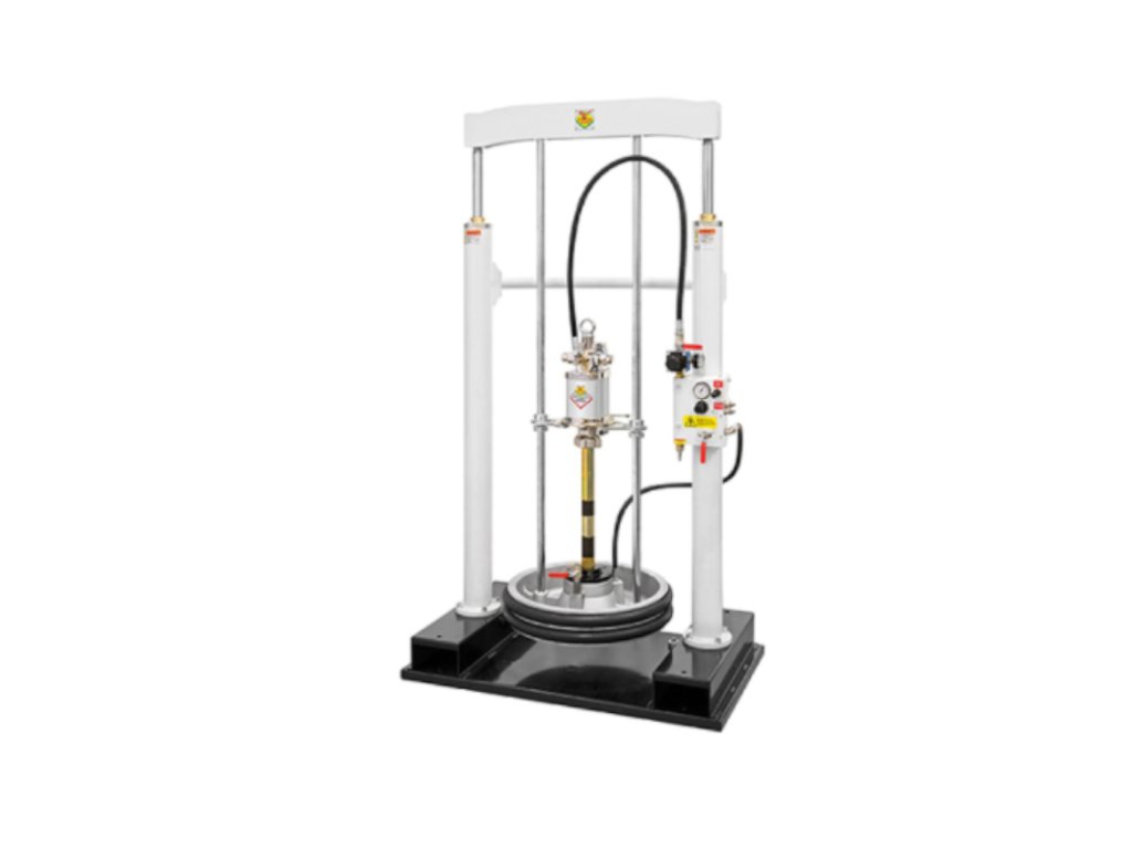 - Das zweiarmige Stativ für pneumatische Kolbenpumpen gewährleistet einen einfachen und schnellen Fasswechsel dank eines Hebesystems mit zwei pneumatisch betriebenen Säulen.