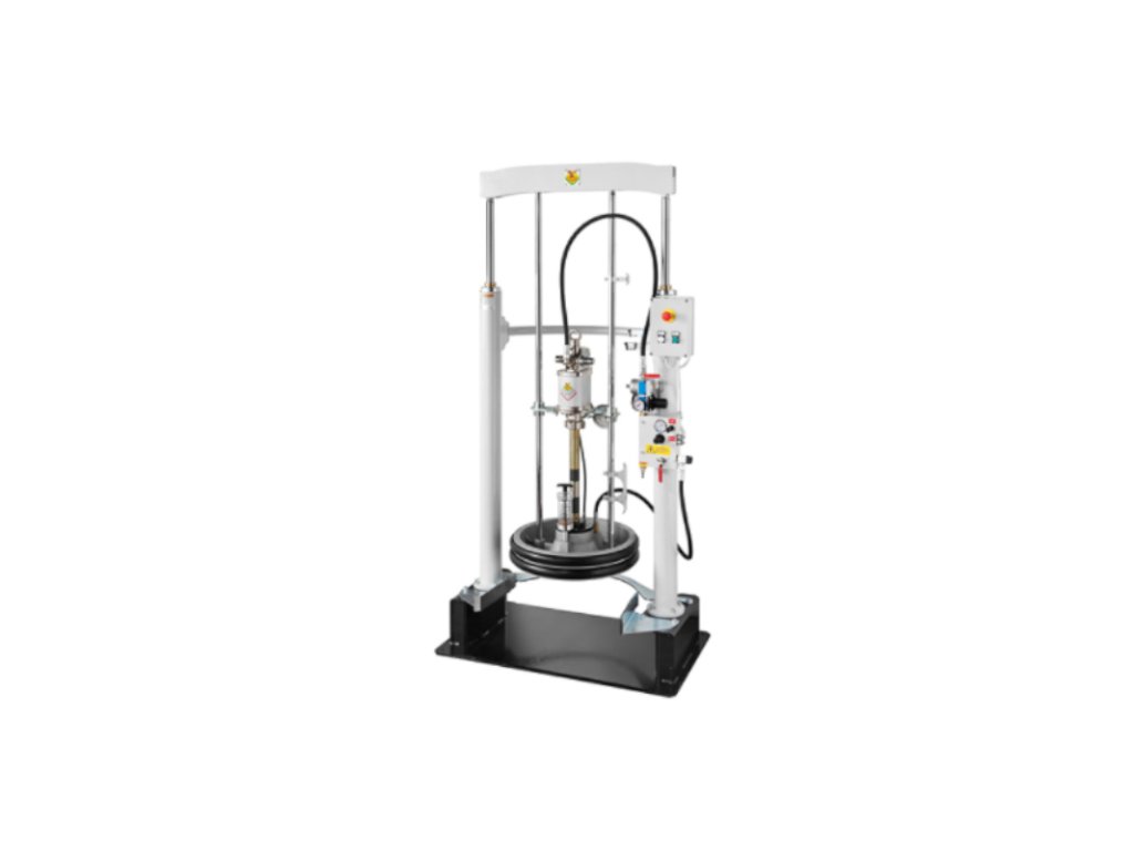 - Das zweiarmige Stativ für pneumatische Kolbenpumpen gewährleistet einen einfachen und schnellen Fasswechsel dank eines Hebesystems mit zwei pneumatisch betriebenen Säulen.