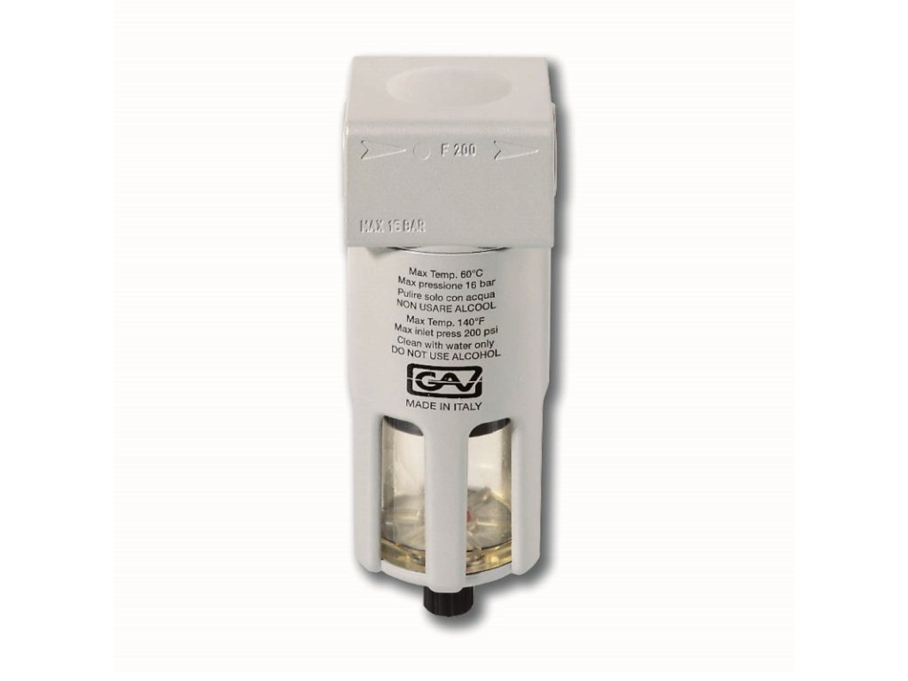 - Filter mit Schutzbehälter und Schnellablass- Filter mit automatischem Abfluss auf Anfrage erhältlich (F200-SA).