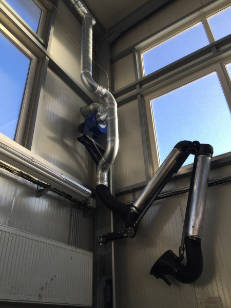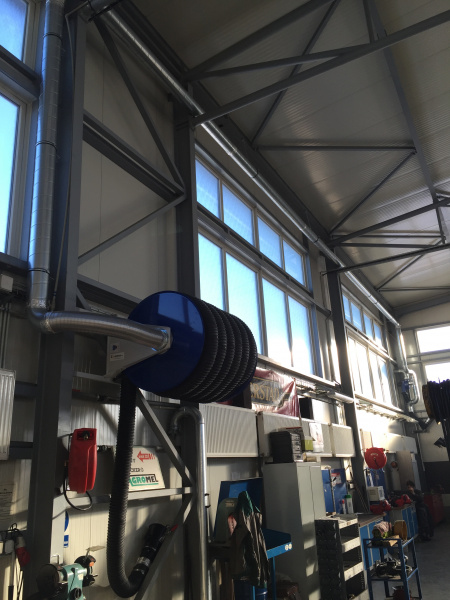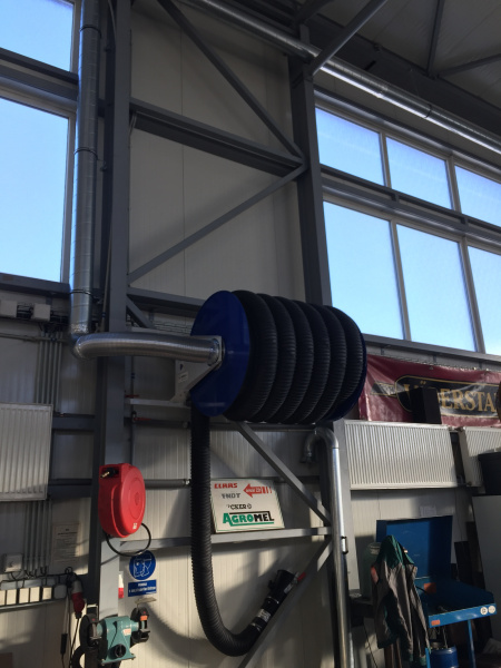 Realisierung einer Abgasabsaugung für den Servicebetrieb Agromel Klíčany. Eine Absaugstelle besteht aus einer Aufwickeltrommel, die zweite Absaugstelle ist mit einem Klapparm ausgestattet.