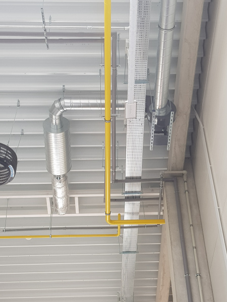 Realisierung der Abgasabsaugung. Auf Serviceständern platzierte Aufroller für die Ausgabe von Betriebsflüssigkeiten. Absaugrohre im Boden installiert und zu Absaugventilatoren unter dem Dach des Gebäudes geführt. Realisierung inkl. kompletter Elektroinstallation.