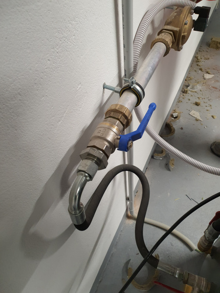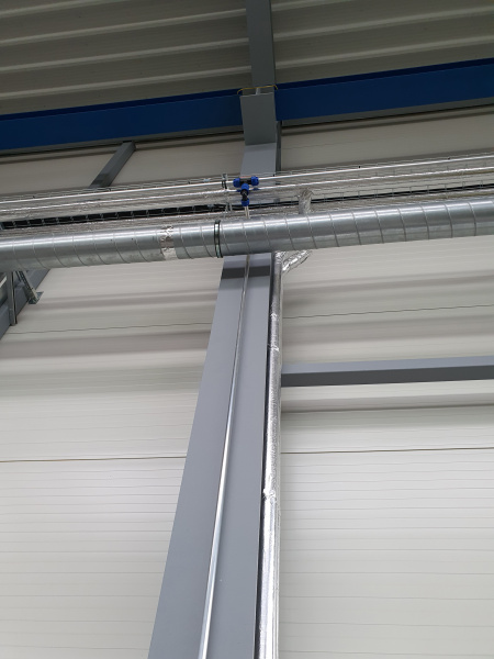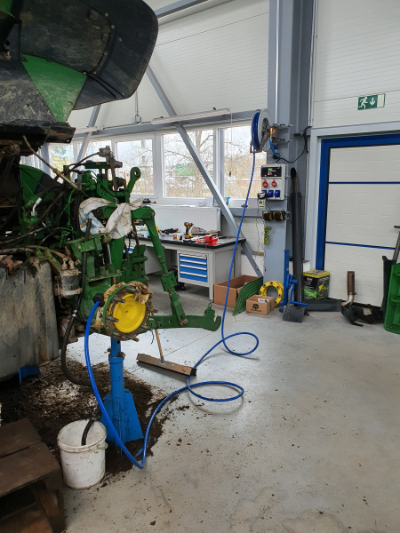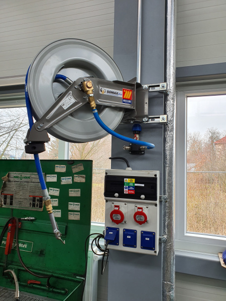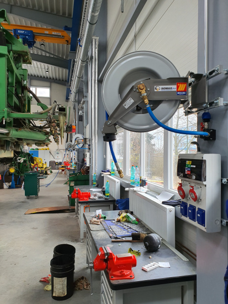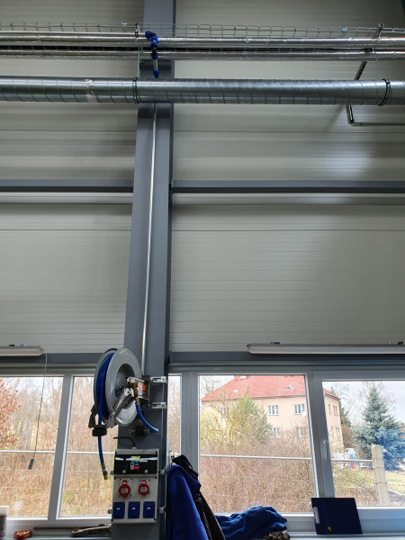 Druckluftverteilung für das Servicecenter für Landtechnik Agrozet České Budějovice. Die Verteilung wurde in Aluminiumrohren mit montierten Kunststoffkupplungen realisiert, die jederzeit eine Änderung der Leitungsführung ermöglichen. Die Luftverteilung endet mit Aufrollern mit Luftschläuchen.