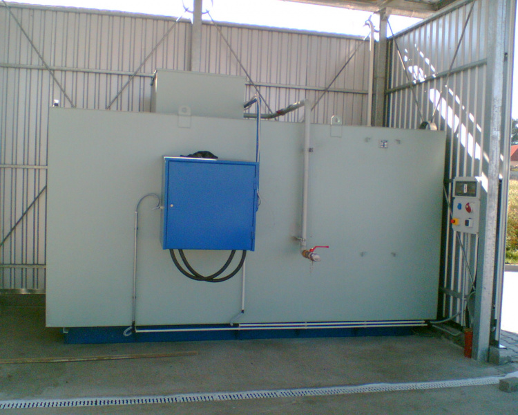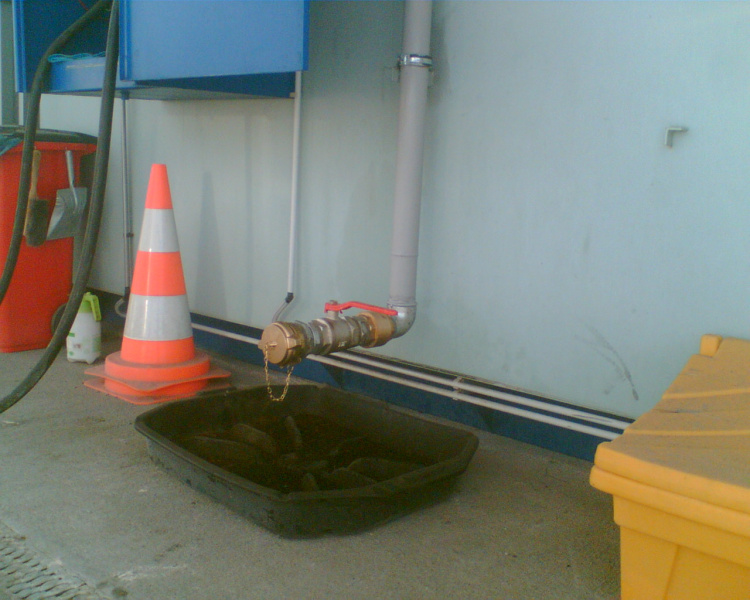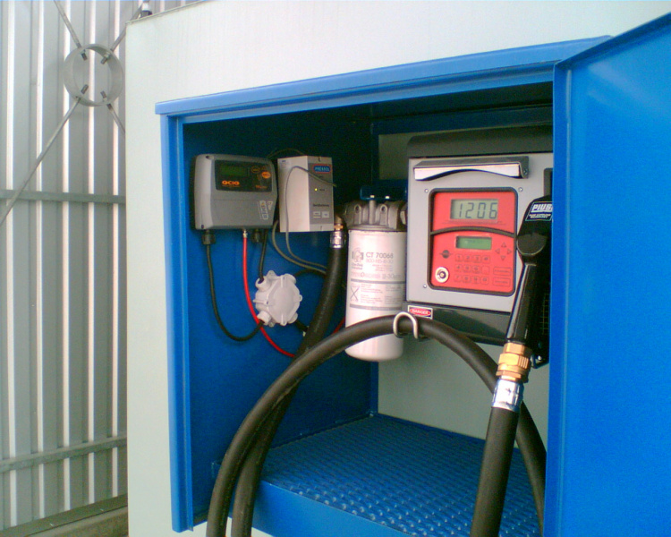Betriebsinterne Tankstelle mit doppelwandigem Metalltank zur Lagerung von Dieselkraftstoff. Zapfsäule mit elektronischer Registrierung in einem abschließbaren Metallschrank.