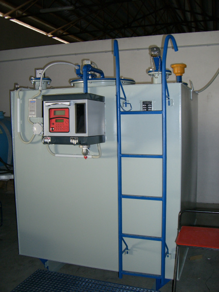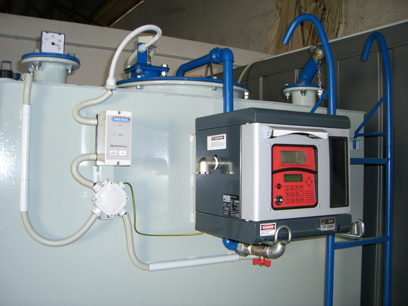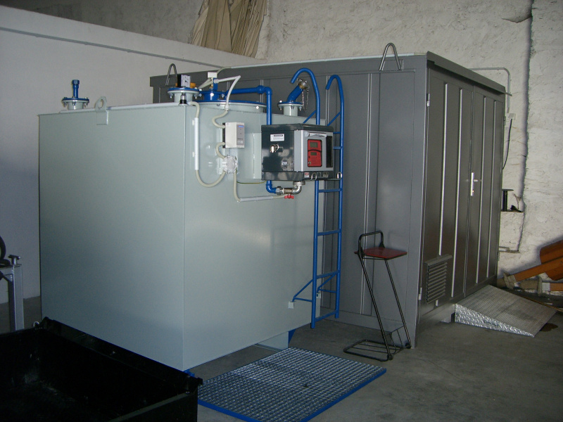 Betriebsinterne Tankstelle für Dieselkraftstoff mit elektronischer Ausgabe und PC-Erfassung. Vollmetallischer, doppelwandiger, quadratischer Lagertank. Der Tank ist mit einer elektronischen Füllstandsmessung ausgestattet.