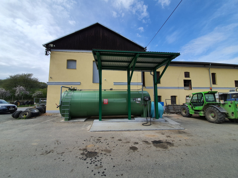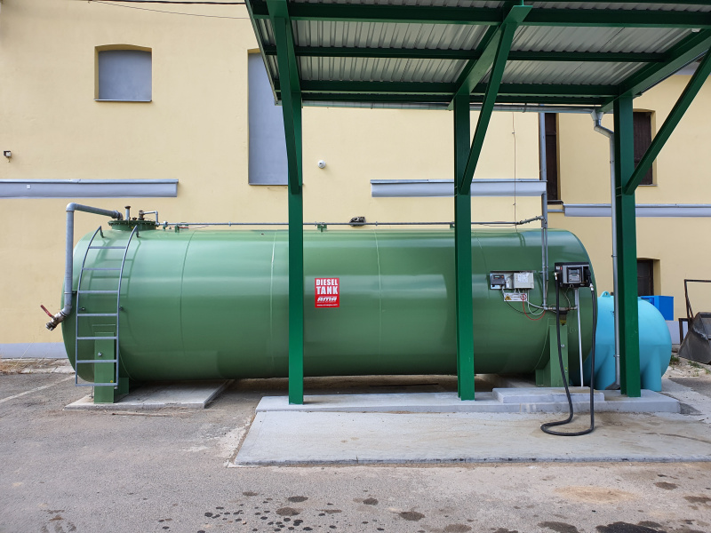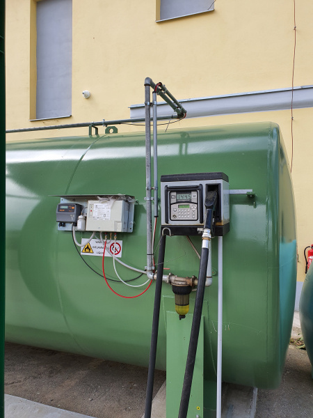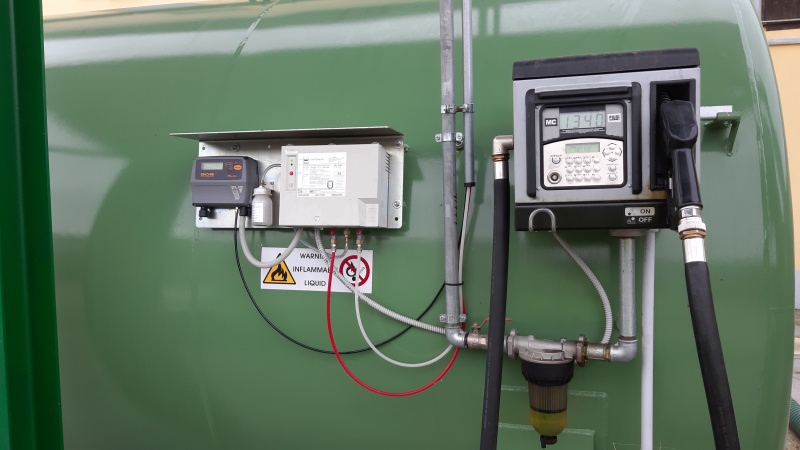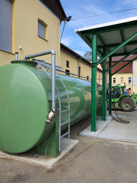 Betriebsinterne Tankstelle für Dieselkraftstoff mit einem doppelwandigen Metalltank mit einem Fassungsvermögen von 30.000 l und einer Zapfanlage mit elektronischer Erfassung und Datenübertragung an eine PC-Software.