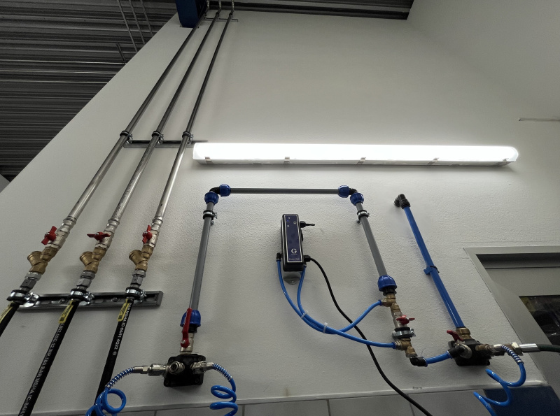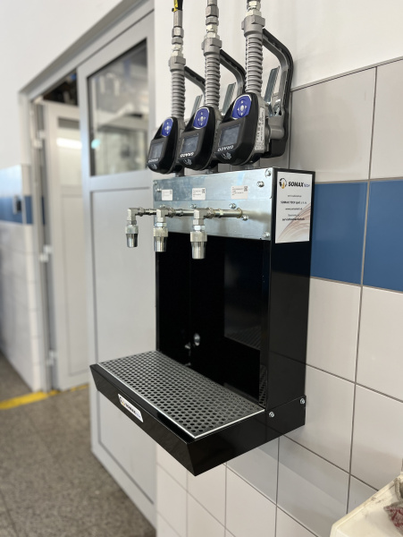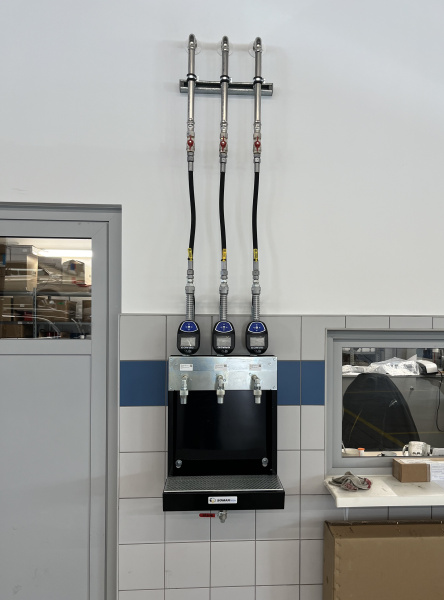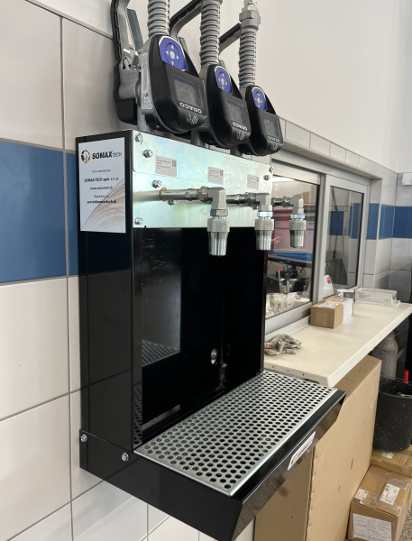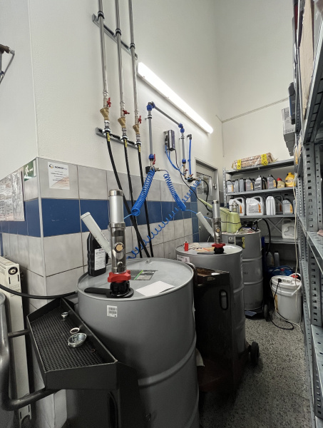 Ölwirtschaft für den Mercedes-Benz Autogroup TT-Service in Trnava. Ausgabe von drei Flüssigkeiten an einer Ölbar, die mit einem modernen drahtlosen Überwachungssystem Pulse Pro mit direkter Anbindung an das DMS Incadea-System ausgestattet ist.