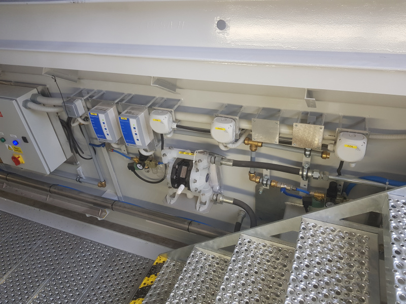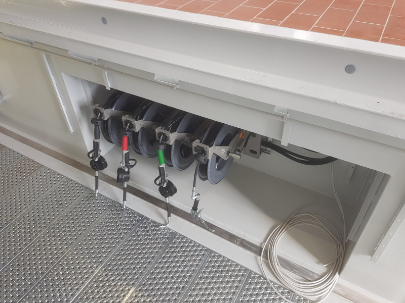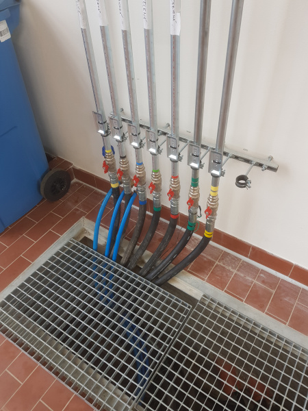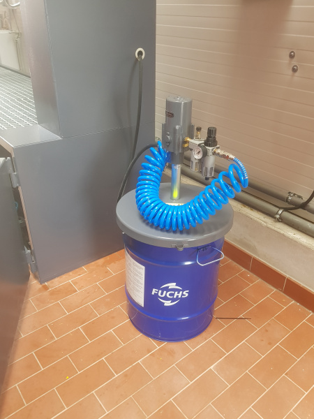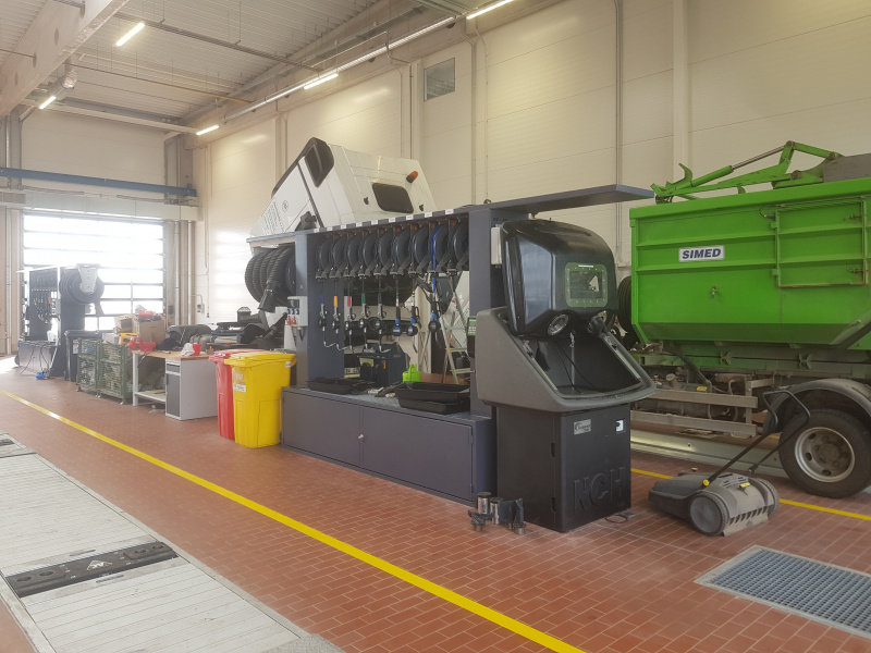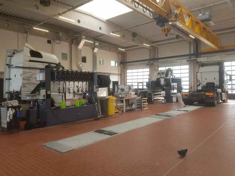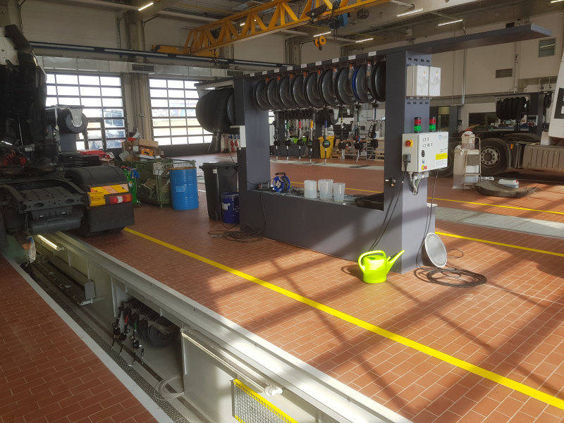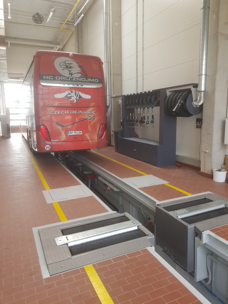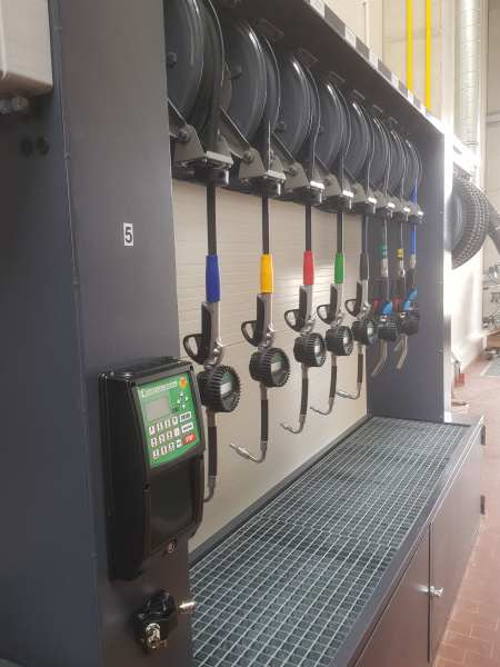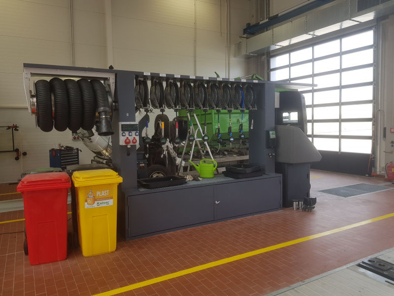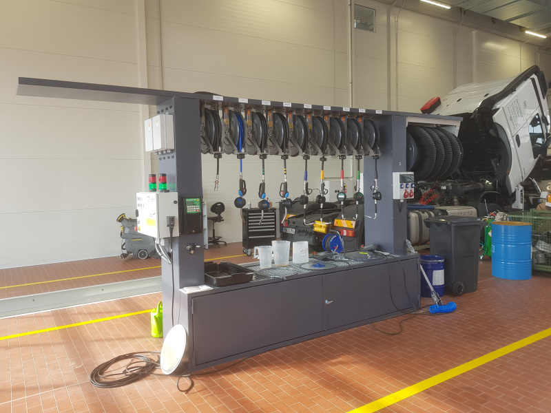 Komplette schlüsselfertige Lieferung für den Mercedes-Benz-Lkw-Service Hošek Motor in Brünn. Ausgabe von neuen Ölen und anderen Betriebsflüssigkeiten aus speziell angefertigten Ständern, die im Raum aufgestellt sind. Jeder Ständer ist mit einem elektronischen Terminal für die Anmeldung der Benutzer und die Erfassung der Aufträge ausgestattet. Alle Daten werden auf einen PC übertragen. Absaugung des Altöls mit Hilfe von Membran-Druckluftpumpen, die sich auf dem Ständer befinden. Öllager im Obergeschoss. Befüllung der Tanks mit Hilfe eines an der Fassade angebrachten Abfüllkastens, der mit Sensoren für den maximalen Füllstand ausgestattet ist. Der Tank für die Lagerung des Altöls befindet sich unterirdisch außerhalb der Werkstatt. Alle Leitungen sind im Boden verlegt.