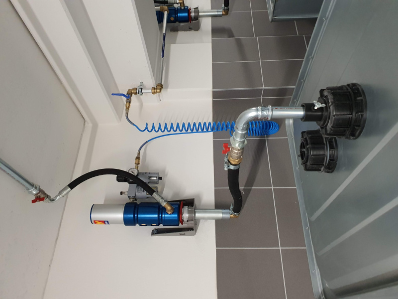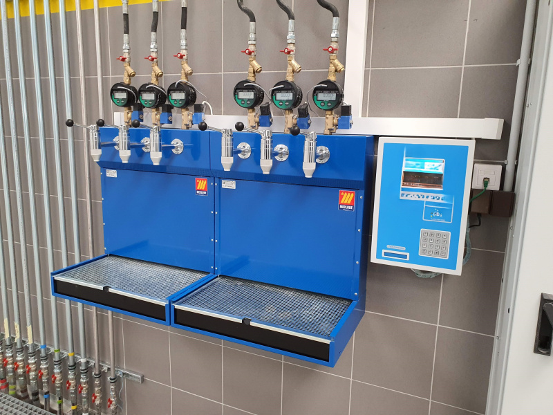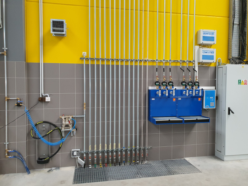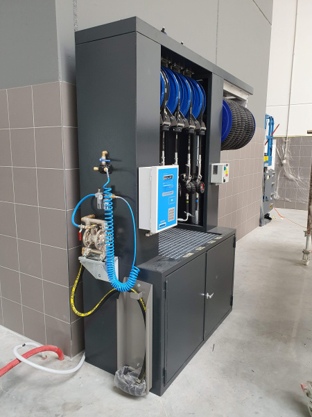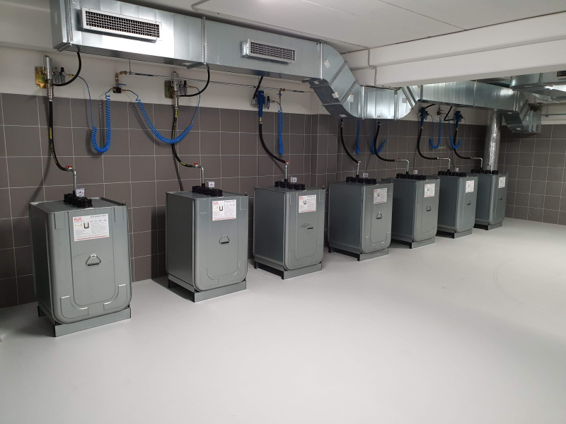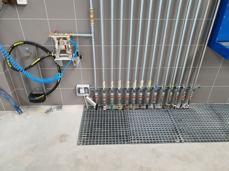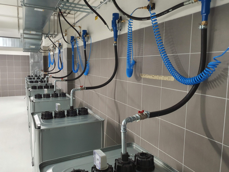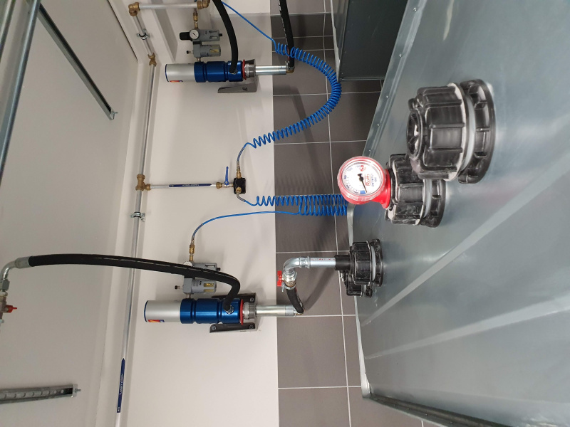 Komplette Realisierung der Ölwirtschaft für das bedeutende Unternehmen APB in Pilsen-Losiné. Insgesamt 37 Ausgabestellen für neue Flüssigkeiten – Öle und Kühlmittel. Sammlung von Altöl in einem unterirdischen Tank mit einer Gesamtkapazität von 15.000 l. Ausgabe aller neuen Flüssigkeiten über ein Überwachungssystem mit direkter Anbindung an die interne Software des Kunden – K2. Lagerung neuer Flüssigkeiten in doppelwandigen Tanks mit einem Fassungsvermögen von 400 l bis 1500 l. Ausgabe der Flüssigkeiten durch leistungsstarke Druckluftpumpen. Sonderanfertigung von Ständern zum Aufhängen von Ausgabewicklern für hohen Durchfluss (Schlauch 1" und Länge 25 m).