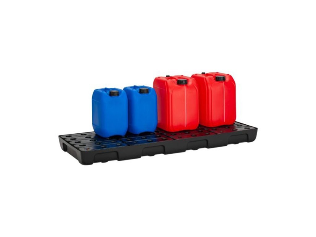 Auffangwanne zum Aufstellen in einem Regal.Ausgestattet mit einem variablen PE-Rost mit mechanischem Schwimmer zur Leckerkennung.