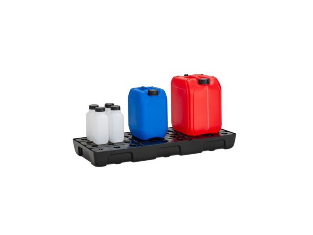 Auffangwanne zum Aufstellen in einem Regal.Ausgestattet mit einem variablen PE-Rost mit mechanischem Schwimmer zur Leckerkennung.