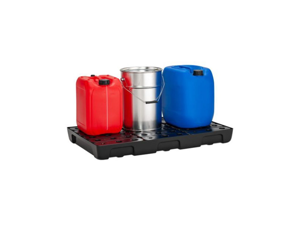 Auffangwanne zum Aufstellen in einem Regal.Ausgestattet mit einem variablen PE-Rost mit mechanischem Schwimmer zur Leckerkennung.