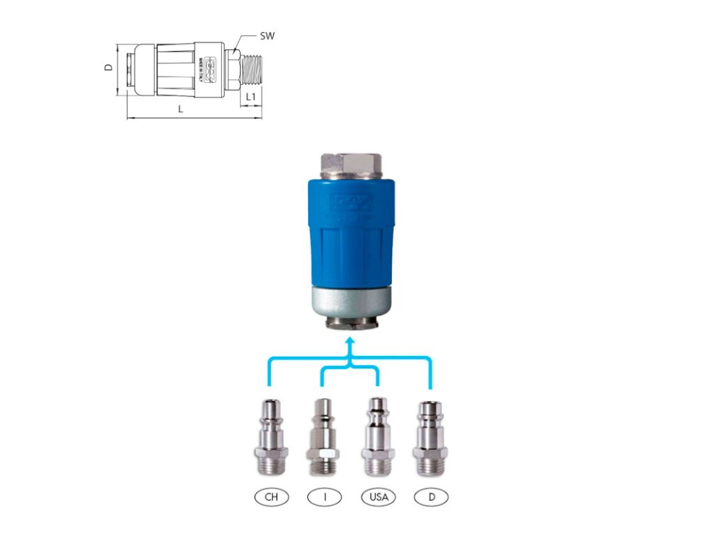 - Universeller Einsatz für Schnellkupplungen Typ CH (Schweiz), I (Italien), USA (Vereinigte Staaten) und D (Deutschland)