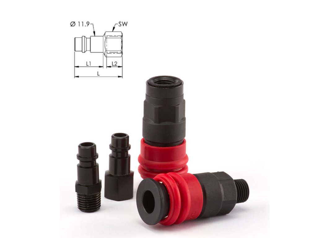 - Serie von thermoplastischen Schnellkupplungen mit europäischem Standardprofil, geeignet für leichte Werkzeuge.- Das spezielle Material, aus dem er gefertigt ist, eignet sich auch für Anwendungen mit fließendem Wasser.