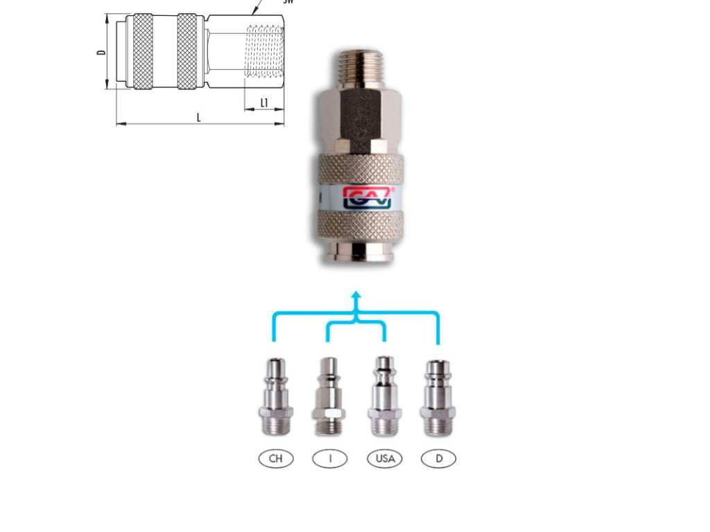 - Universal-Schnellkupplung mit sechs Kugeln (Edelstahl)- Geeignet für verschiedene Profile mit sehr hohem Luftdurchsatz